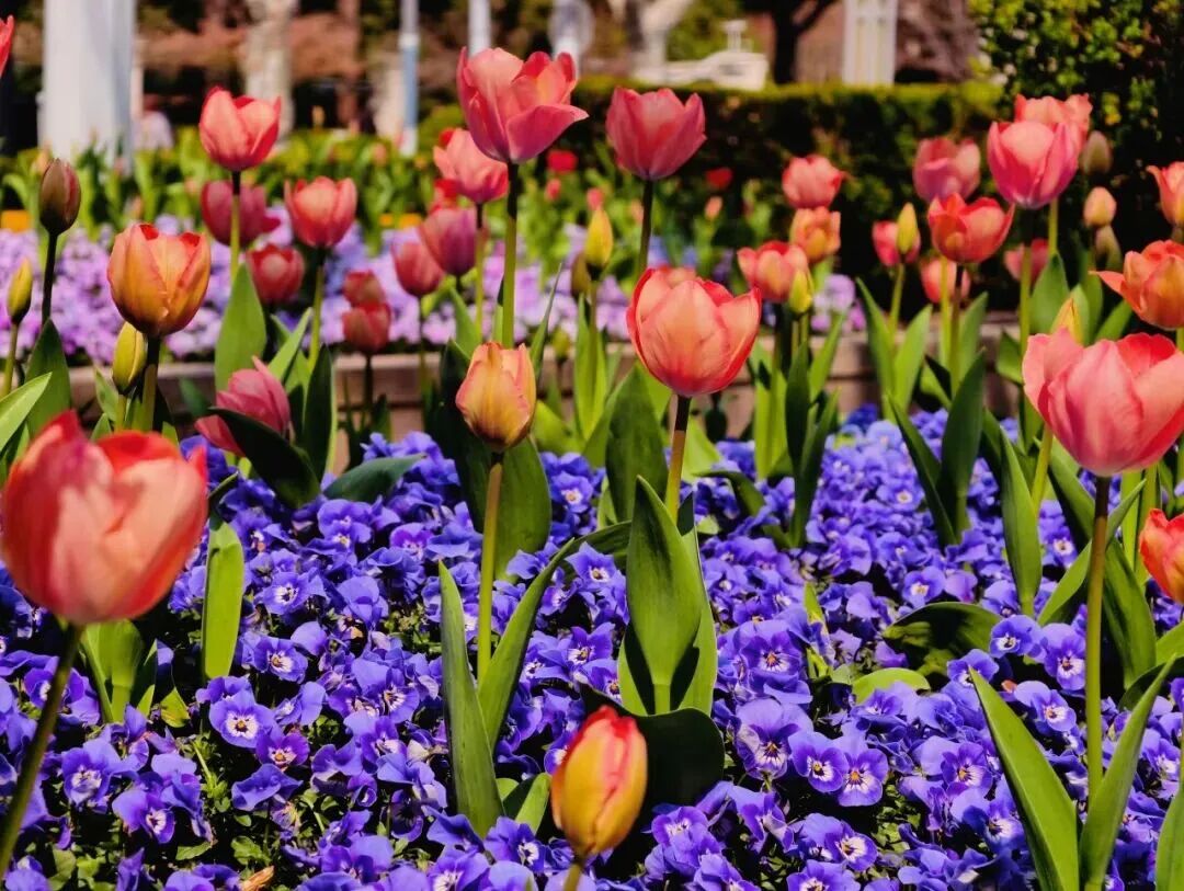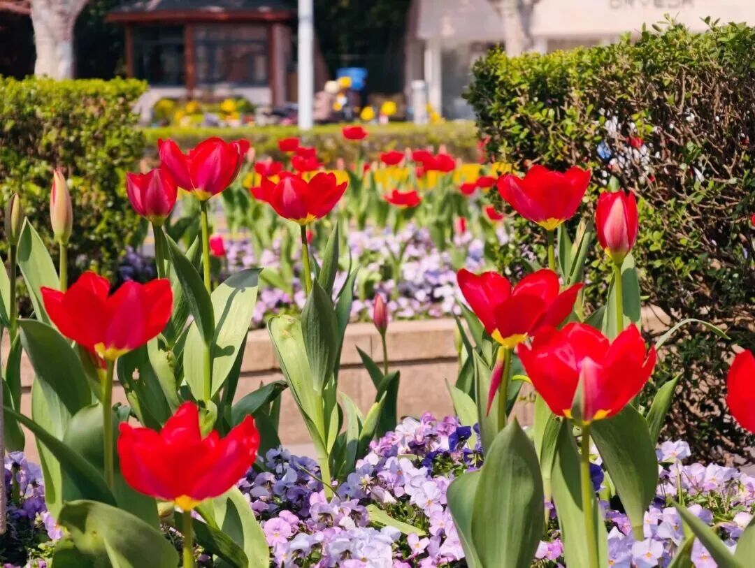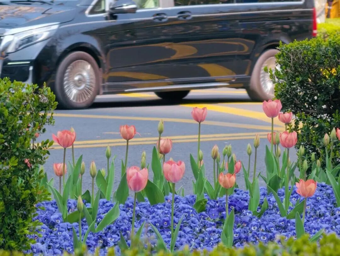 逛完吴江路和张园,沿着南京西路行走,继续感受静安的春日繁花。路边的绿化带里,橙粉色、红色的郁金香与紫色的角堇错落搭配,像一条流动的花毯。