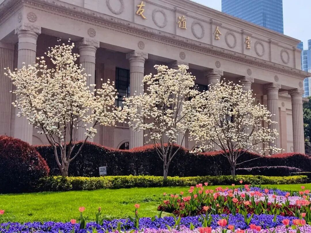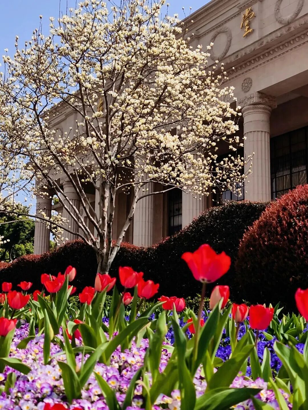 上海展览中心友谊会堂前,数株白玉兰与树下橙粉色、红色的郁金香相映成画。