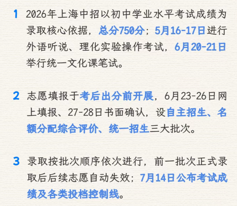 市教育考试院介绍,根据《上海市教育委员会关于印发<上海市初中学业水平考试实施办法>的通知》(沪教委规〔2023〕5号)、《上海市教育委员会关于2026年上海市高中阶段学校招生工作的若干意见》(沪教委基〔2026〕2号,以下简称《若干意见》)等,现就2026年上海市高中阶段学校考试招生工作提出如下要求。
