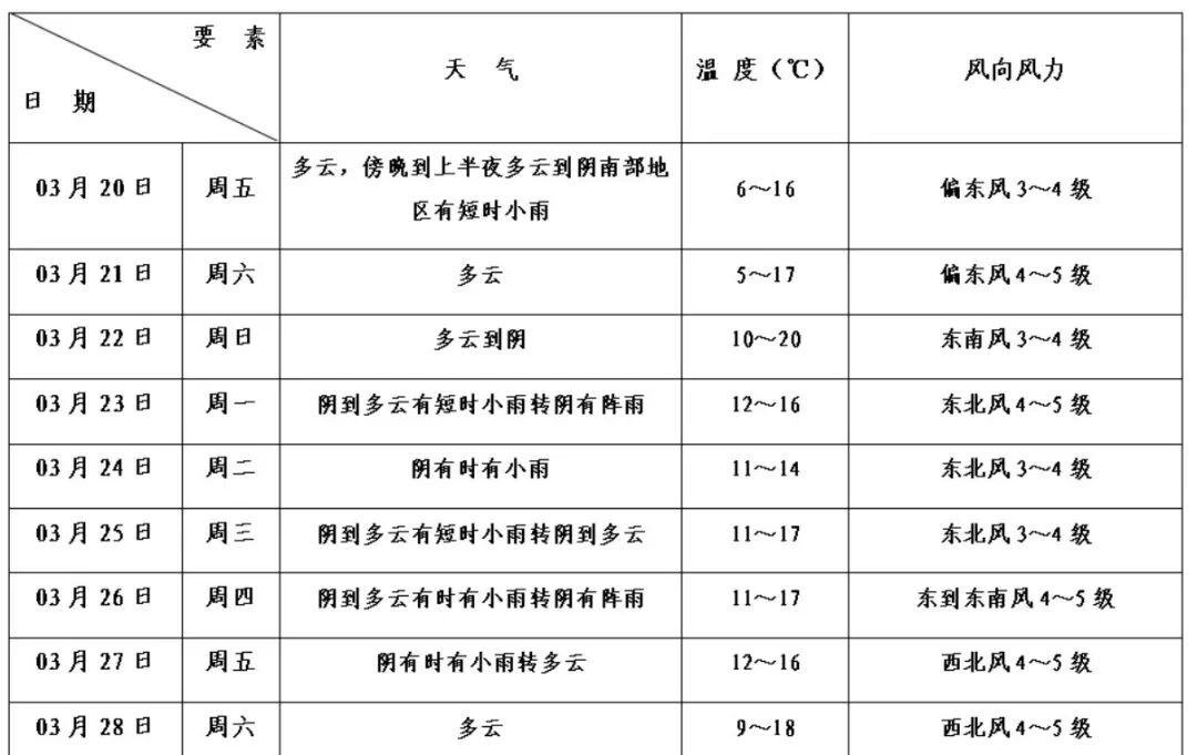 周日:多云到阴,11—19℃,东南风3—4级。