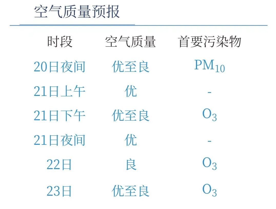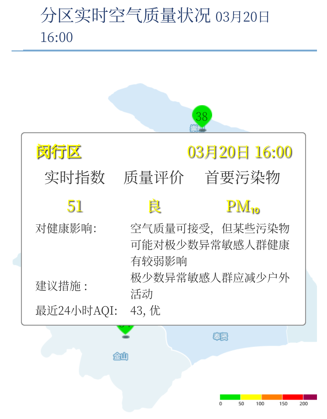 3月20日16时,闵行区AQI为51,良,昨天AQI为43,优。根据上海市环境监测中心预报,今天夜间空气质量优至良;明天上午优,下午优至良,夜间优;后天良。