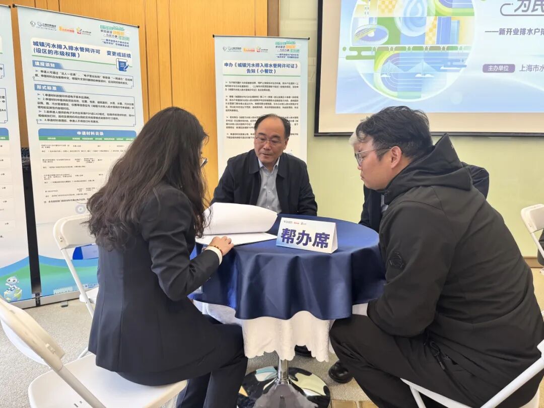 在临时受理窗口,现场设立了两个专属受理工位,为符合排水许可证申请条件的企事业单位和沿街商铺提供排水许可申请集中受理服务。活动期间,市、区两级相关部门负责人以“首席帮办员”身份进驻帮办服务点,通过全流程陪同帮办推动政务服务提质增效。