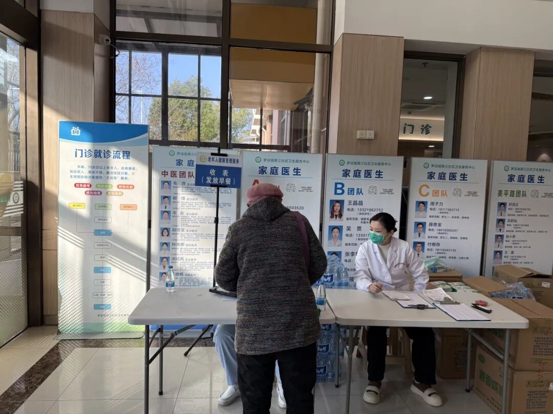 中心家庭医生团队前往居民区所在村居委进行现场登记预约。