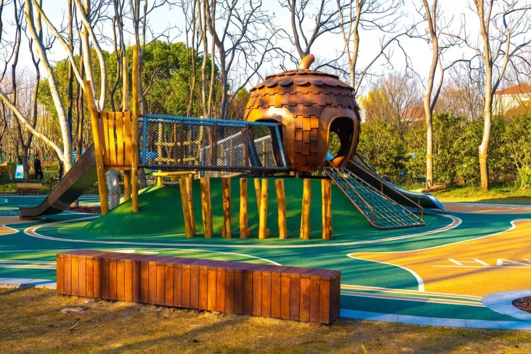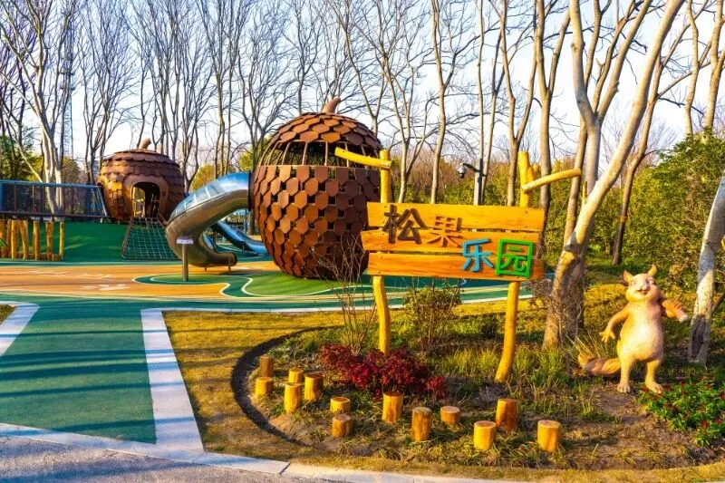 走进启动林公园内的“松果乐园”,仿佛踏入了一个由松果编织的“童话世界”。乐园以棕色的松果为设计主题,将自然元素巧妙地融入每一个游乐设施之中,松果形状的滑滑梯、松果造型的攀爬网,还有小巧可爱的松果小板凳,每一处细节都充满童趣,让孩子们在游玩的同时,真切地感受到大自然的魅力。