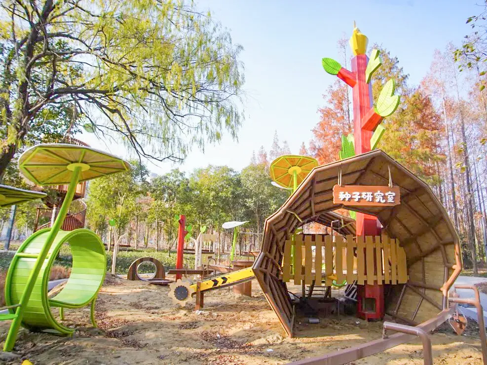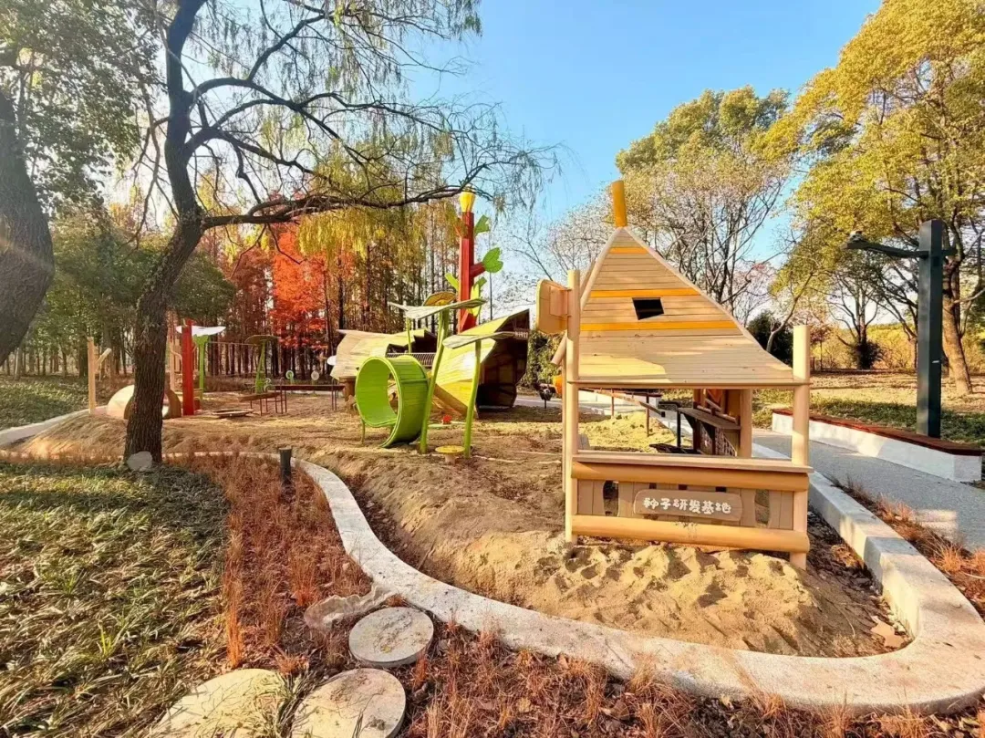 公园最吸引人的,是藏在林间的无动力探险设施和互动沙坑——孩子们可以在森林里攀爬穿梭,在沙坑中堆城堡、挖沟渠,尽情释放天性。公园还设有森林露营区和种子研究室,让小朋友在玩耍之余,近距离观察植物的生长奥秘,真正实现“玩中学”。