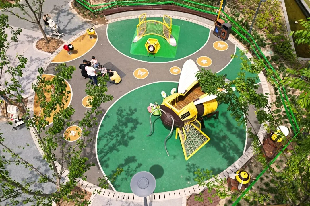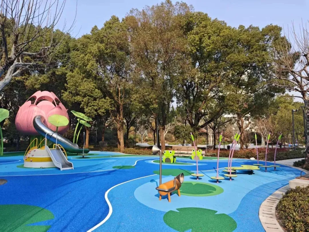 新打造的“荷趣”主题儿童乐园别具一格,地面铺装设计宛如荡漾的荷塘,青蛙、荷叶、荷花造型的无动力设施充满了童真童趣。而且,全园实现了无障碍连通,推着童车也能轻松畅游,真正做到了带娃、遛弯两不误。