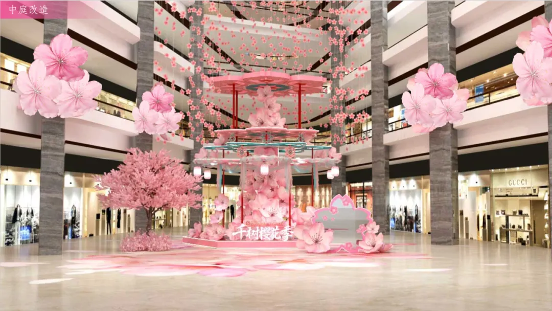 商场里,L层日出空间设有樱花季限定装置“云樱秋千”,中庭以大型樱花主题美陈“满庭樱海”呈现一场视觉震撼的春日盛宴;5楼更设有“揽樱天际”大型可爱气模,让观展赏花更添一份惊喜。