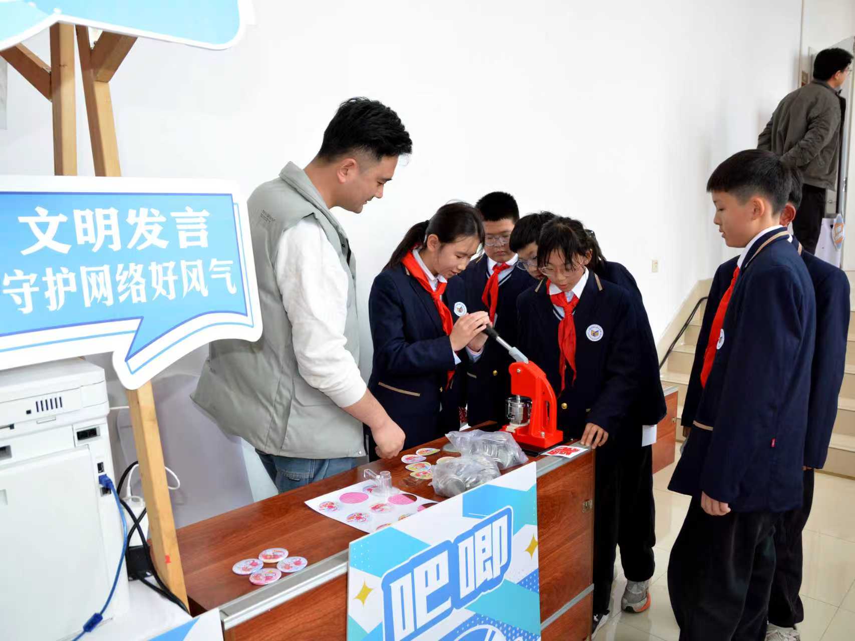 文创手工市集设置AI创意制作区与DIY手工体验区,将“不轻信”“防沉迷”等网络保护关键词,融入AI光栅画、AI徽章制作、机器人互动,以及香囊、拓印、书签、剪纸等传统手工艺制作,让同学们在动手实践中学习网络安全知识。