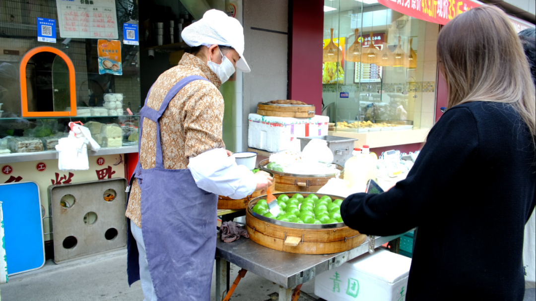 第一家,在江川路街道已经守了十多年。制作青团时,大盆搅拌,双手捏团,力道均匀,每一寸揉捏都恰到好处。新鲜榨取的艾草汁,瞬间染绿了雪白的糯米团,那是春天的颜色。