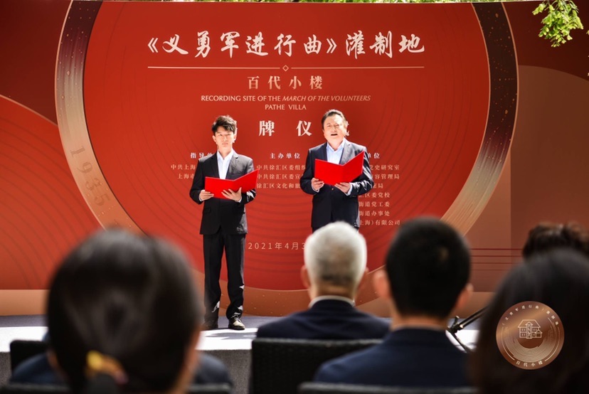 中共上海市委党史研究室副主任谢黎萍、上海市文化和旅游局副局长张旗为“上海市不可移动革命文物”:百代小楼——《义勇军进行曲》灌制地揭牌。百代小楼——《义勇军进行曲》灌制地主题展览,得到了众多党史专家、文化学者的大力支持和指导,为更好地传播这段故事、弘扬民族之声,他们还将以自己的倾力研究和心灵记忆,继续传递红色文化基因根植的精神感悟。仪式上,“中国流行音乐之父”陈歌辛之子、中国当代著名作曲家陈钢、党史研究者苏智良、徐国梁、音乐文化学者韩斌、著名作家淳子,被聘为首批“《义勇军进行曲》灌制地专家团”成员。原址位于百代小楼的中国唱片(上海)有限公司,也向徐汇区文化和旅游局赠送了《义勇军进行曲》金属母盘复制品。