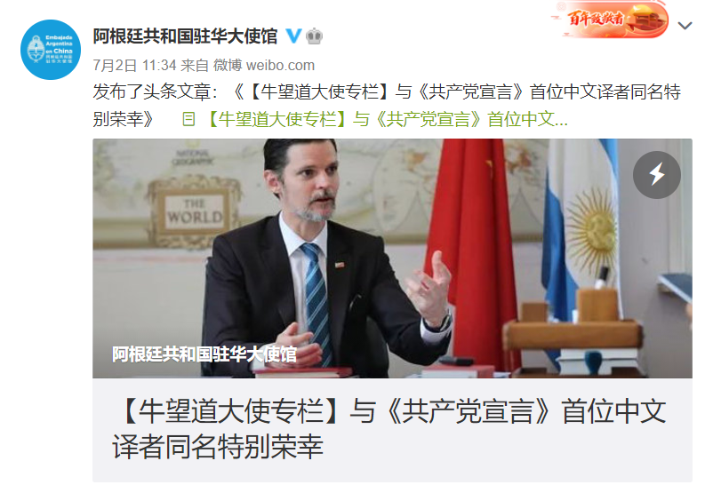 阿根廷驻华大使馆官方微博刊发了牛望道大使的署名文章“与《共产党宣言》首位中文译者同名特别荣幸”,这是一篇2000余字的长文。