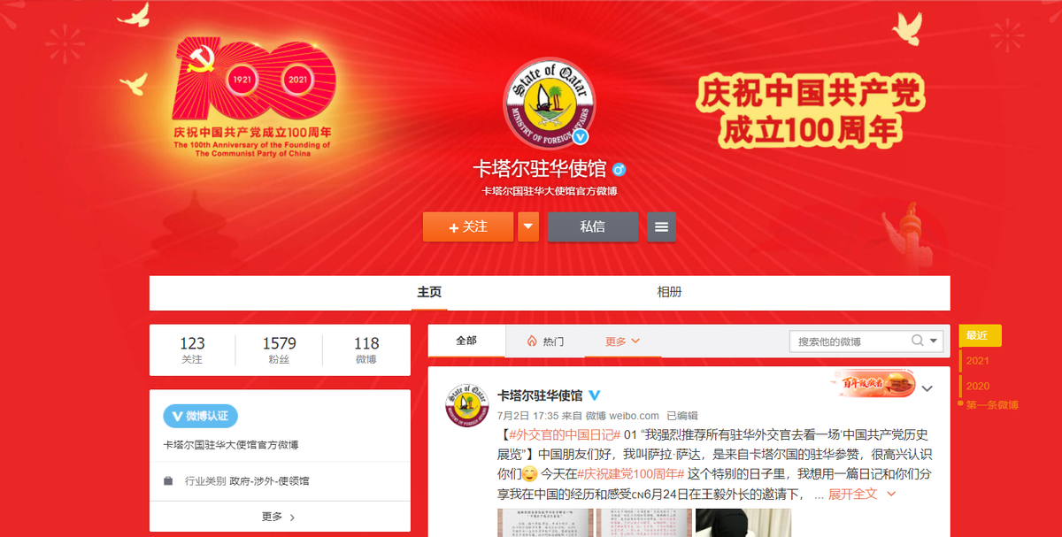 值得一提的是,卡塔尔驻华大使馆还专门将官方微博背景改为了“庆祝中国共产党成立100周年”的红色喜庆模板,这在外国驻华使馆中并不多见。