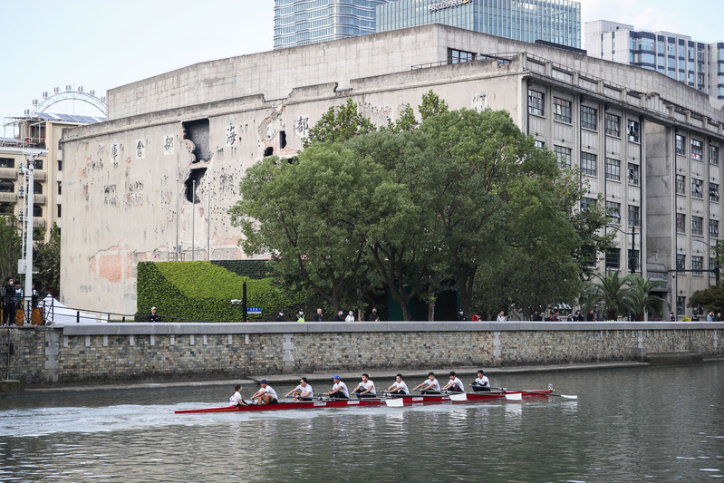 一叶叶扁舟规律跃动,奋力划桨的运动员们,岸上观赛、休憩的市民,伴着满是历史印痕的苏州河众桥,和邮政博物馆、四行仓库、上海总商会等最经典的历史建筑、海派风情,处处生机勃勃。