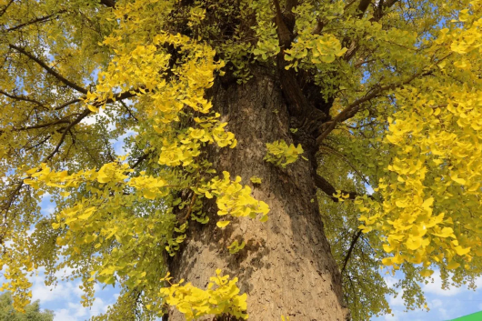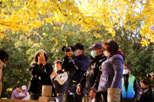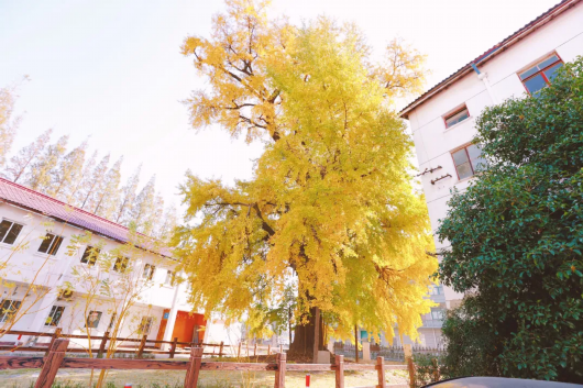 放眼望去,古银杏的大部分叶子已变得金黄,随风摇曳,泛着点点金光。