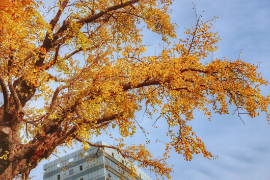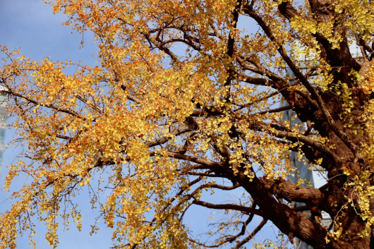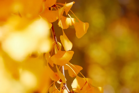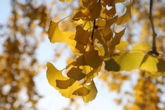 金黄的树叶在秋日的阳光下熠熠生辉。