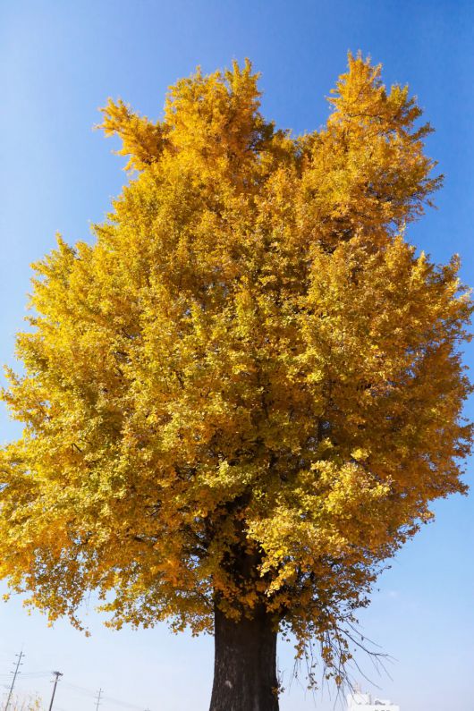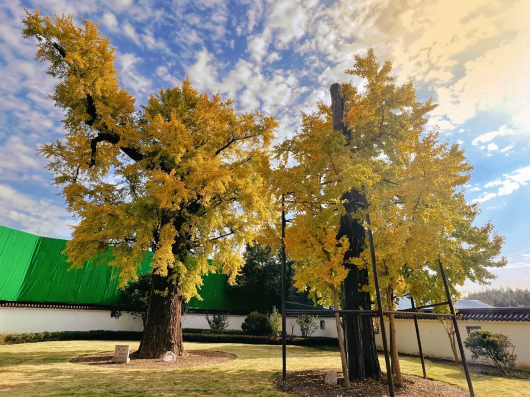 0050号古银杏树高9米,冠幅5米;0051号古银杏树高14米,冠幅8米,更为粗壮。两棵古树枝繁叶茂生机勃勃,银杏叶金黄灿烂。