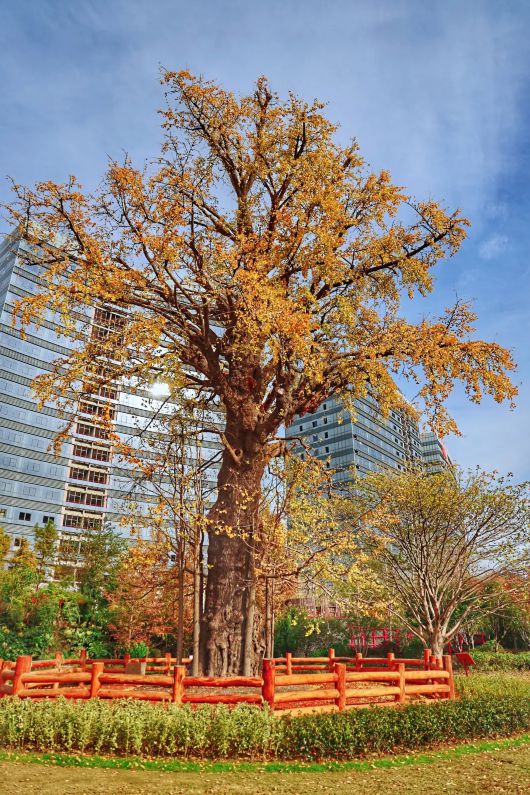 在真新街道栅桥绿地公园,这棵700多岁的古银杏树已经金黄。