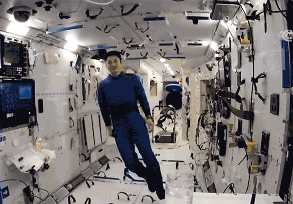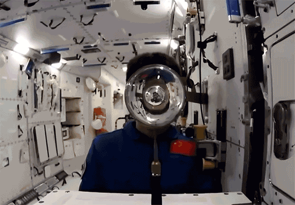 太空泡腾片实验。王亚平将泡腾片放入蓝色水球,水球变成气泡球,像一颗蔚蓝的地球。