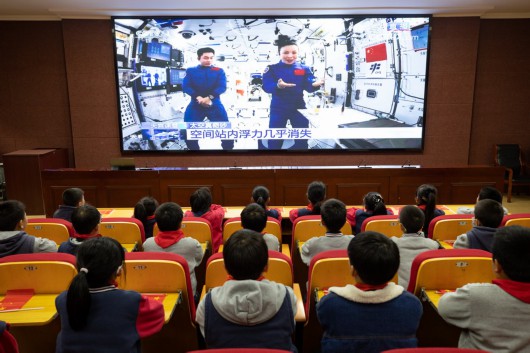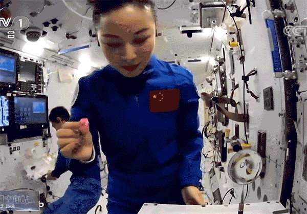 2021年12月9日,中国空间站上的三名神舟十三号机组3名成员翟志刚(中 )、王亚平(左 )和叶光富(右)分别向地球上的学生致意。