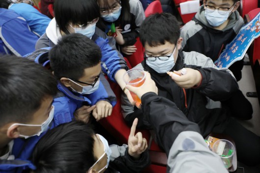 2021年12月9日下午,沈阳市第五十一中学,省科技馆工作人员现场指导学生与正在执行我国太空任务的三名宇航员同步操作演示液体表面张力实验。