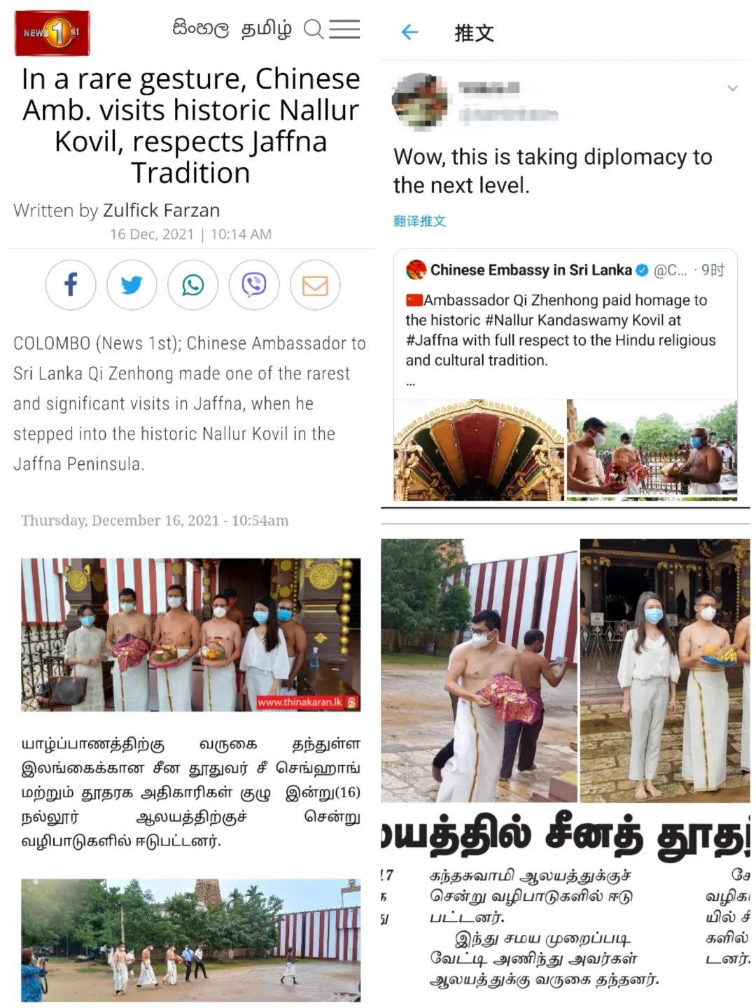 戚一行按照泰米尔传统(男士袒露上身、腰以下着白布,以示对众神尊敬)进入寺庙,在寺庙祭司引导下遵照印度教仪轨先后参观了庙内各殿龛、塑像及壁画。多家泰米尔媒体前往现场争相直播,斯社交媒体也纷纷对此访予以高度评价,对中国外交走入民间、走进基层、走近人心的新形式表示赞赏,对中国大使充分尊重泰米尔民族文化及信仰表示感谢。