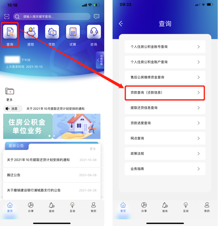 登录上海公积金APP,进入个人业务板块,选择“查询”中的“贷款查询(还款信息)”。