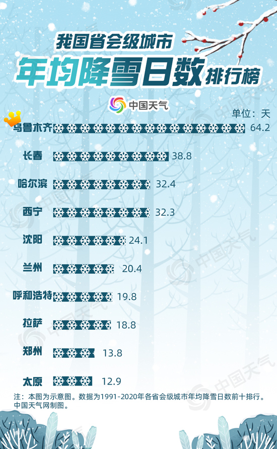 如果想赏雪,可以去东北、内蒙古以及青藏高原、山东半岛北部,这些地方遇雪概率高。从省会级大城市的降雪日数来看,乌鲁木齐以年均雪日64.2天遥遥领先,长春、哈尔滨、西宁也都超过30天;北京、石家庄、太原等城市大多在11至13天左右;杭州、合肥、武汉、南昌、上海为5至9天之间;福州、广州、南宁等地年均雪日不足1天。