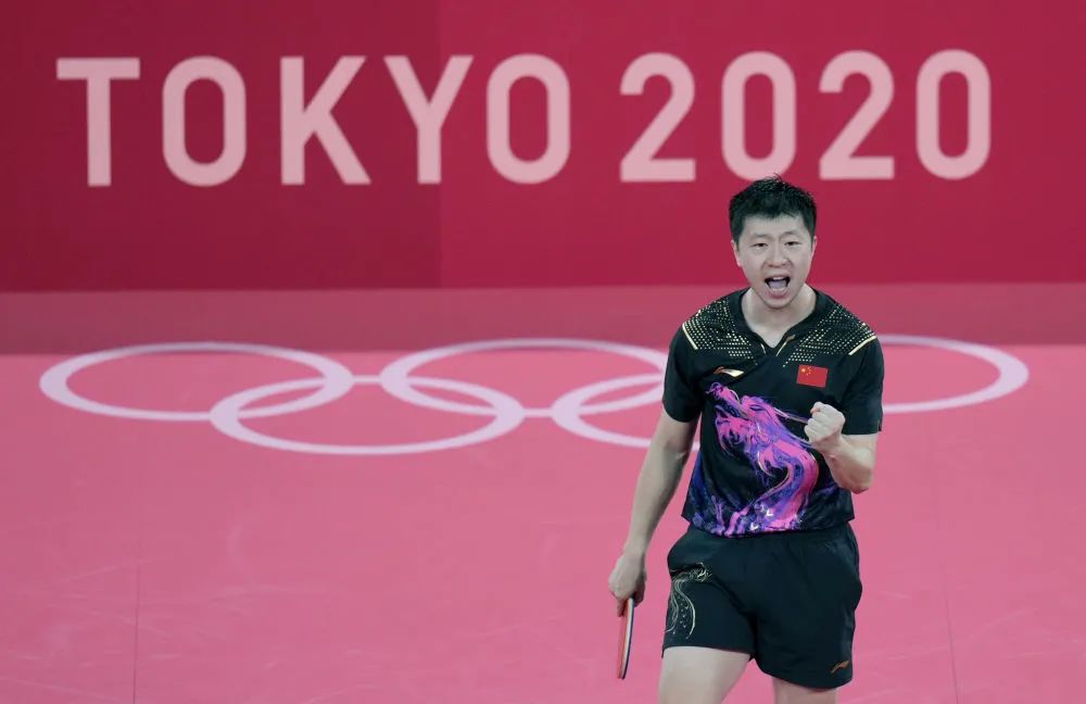 马龙在东京奥运会乒乓球男子单打决赛中庆祝得分。新华社记者王毓国摄