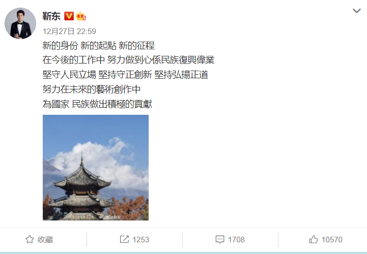 有了新身份之后,靳东发文表示:“新的身份,新的起点,新的征程。在今后的工作中,努力做到心系民族复兴伟业,坚守人民立场,坚持守正创新,坚持弘扬正道;努力在未来的艺术创作中,为国家、民族做出积极的贡献。”