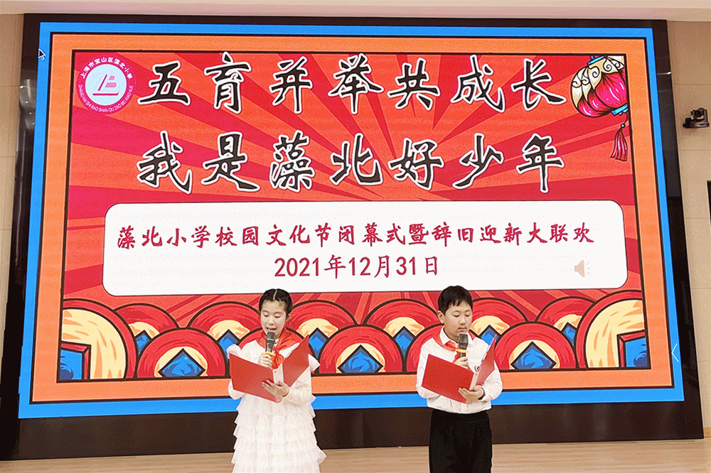 藻北小学举行了“五育并举共成长,我是藻北好少年”校园文化节闭幕暨辞旧迎新大联欢活动。大队部为一年级的小朋友颁发了闪闪的红星章,全校师生共同回顾校园文化节的精彩集锦。在此次文化节中孩子们展现出了自己优秀的才能,获得了好成绩。在学生串烧表演后,校领导为当选小小讲解员的学生授旗。同学们还欣赏了线上亲子同台秀,家长和孩子共同参与迎接新年。