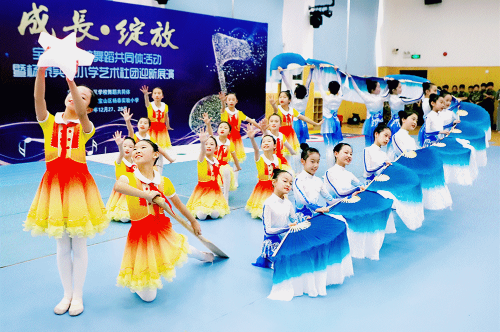 “成长•绽放”——宝山区学校舞蹈共同体活动暨上海市宝山区杨泰实验小学艺术社团迎新展演如期举行。展演分为基本功展示和剧目展示,基本功展示让在场的观众感受到了在每一个流畅娴熟的动作背后是孩子们勤学勤练的背影;舞蹈《吉祥舞韵》《逐浪的歌谣》《我也想当兵》,表达了孩子们对舞蹈的热爱,对生活的美好憧憬。