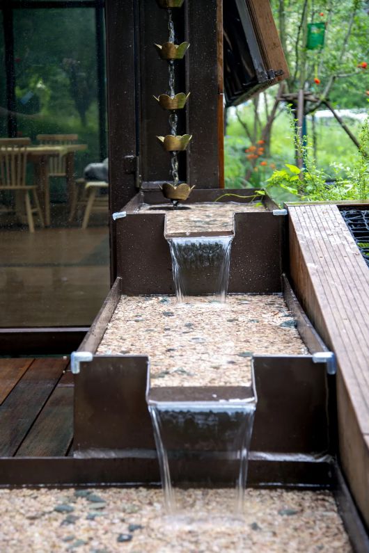 山房特有的斜顶设计,将雨水排向一角,汇集在花瓣形的金属雨水收集器中,小瀑布似的层层向下流出,落在具有四层砂石过滤系统的木箱中,最终流向一旁的鸢尾池塘成为自然净水,为市民和青少年生动地上了一堂水生态科普课。