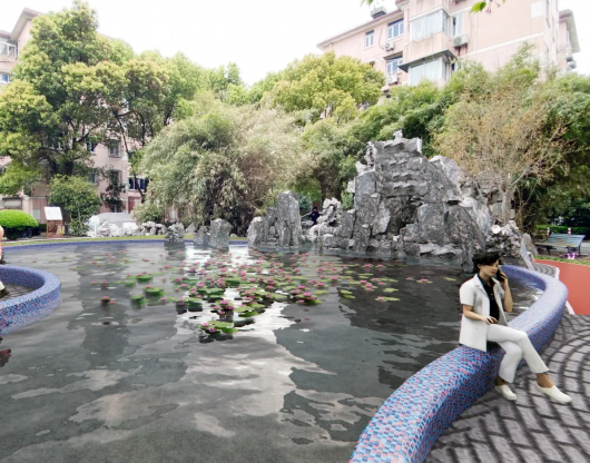 “鱼戏碧莲”利用原有的锦鲤池改造成居民休闲景观池,占地220平方米。物业定期对池子进行清淤翻底,雨季收集雨水用于日常景观池喷泉补水,在绿化养护季节则直接从池中抽水对绿化进行浇灌。