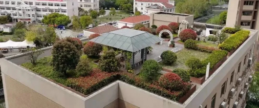 “空中花园”是一处500平方米的楼顶景观,有池塘、凉亭和各类种植区域。这里四季常青,每一个角落都绿意盎然,既为人们开辟了新的休息、娱乐活动场所,同时也加强了屋顶的隔热效果。