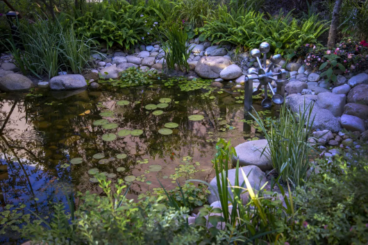 通过人工压水泵,就可以从一旁的南渔浦中提取自然河道水。河水经多道砂石的过滤,达到了净化效果,再穿过“自然之眼”花墙,形成非常有趣的瀑布景观。抽上来的水穿过旱溪,汇集在“鸢尾池塘”中。旱时,自动提水补给,灌溉旱溪中的花草;雨天水位上涨至一定高度,则排出南渔浦。