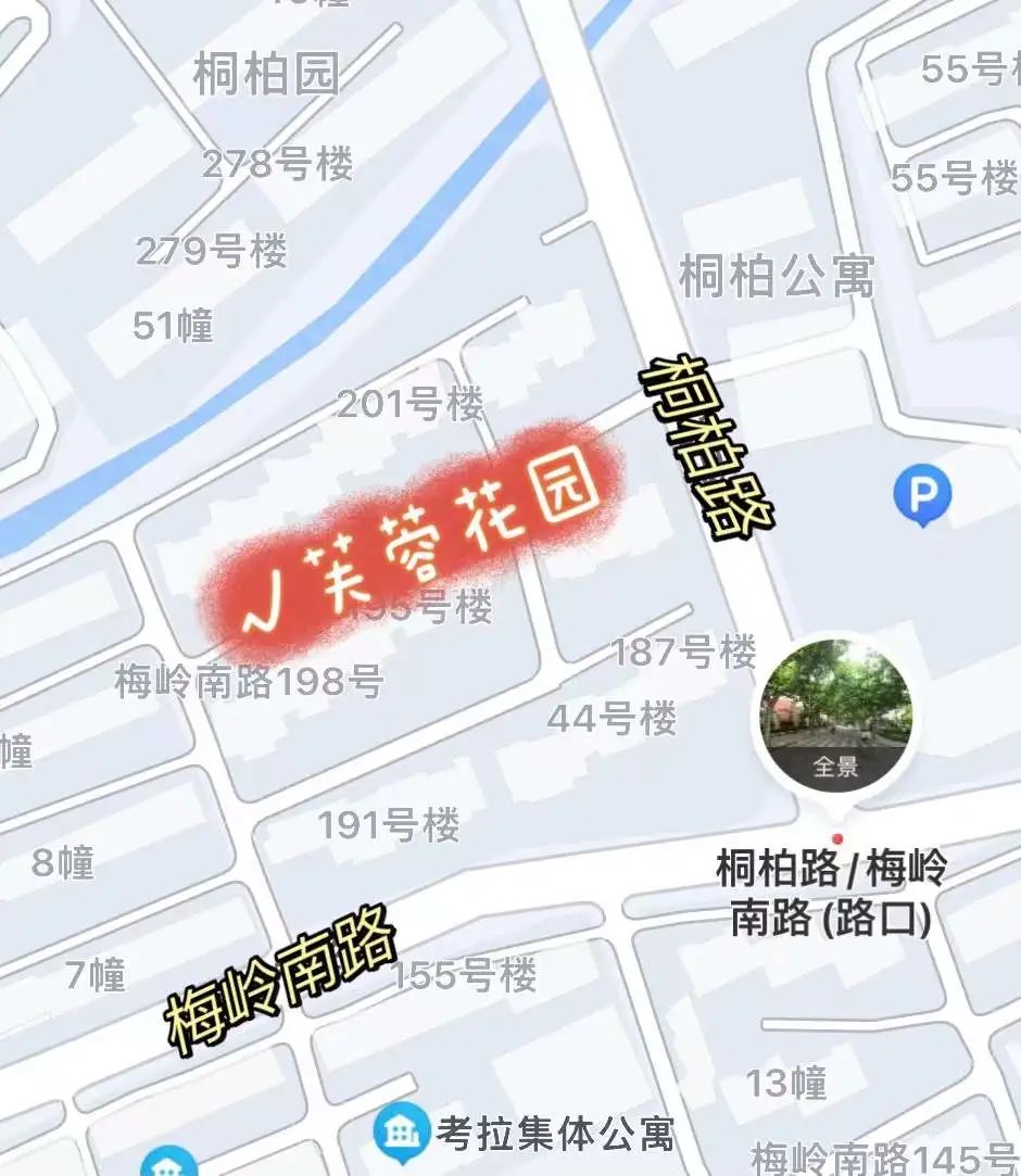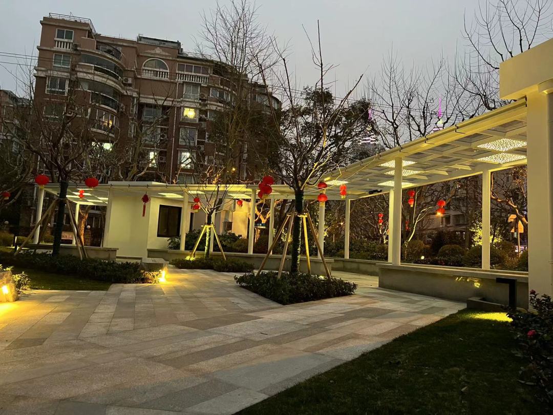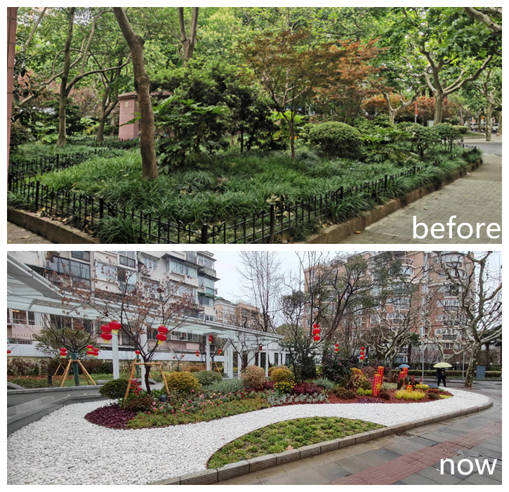 芙蓉花园位于梅岭南路桐柏路西北角,面积约800m2。原绿地乔、灌木整体布局较为紧凑,普陀区绿化市容局通过翻新原有两栋建筑物、增加衔接两处建筑的白色景观连廊,保留长势较好的乔木。