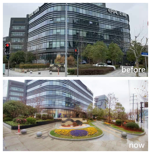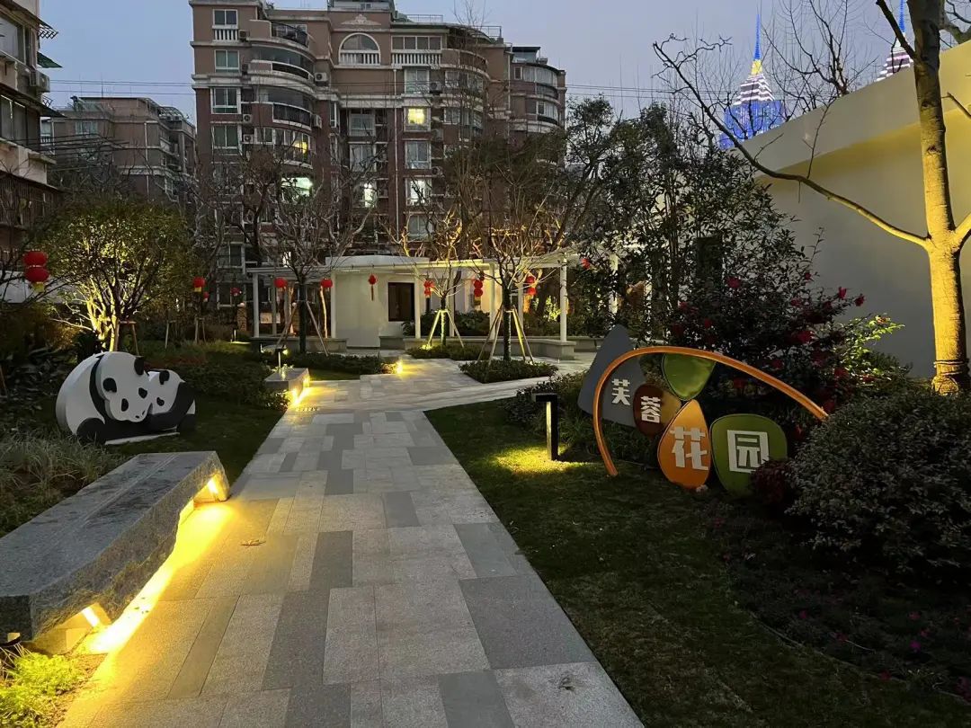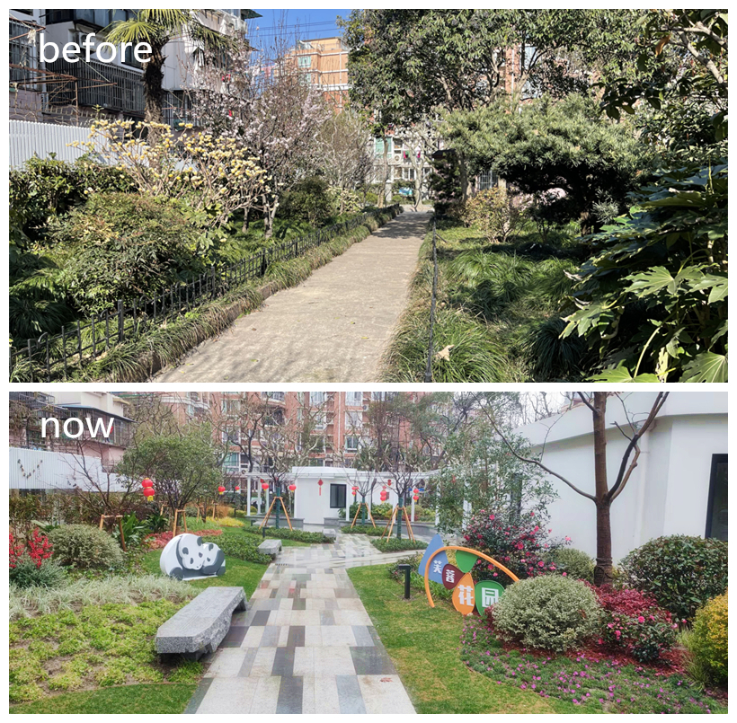 花园新增开花早樱,秋色叶枫树,丰富季相变化。植物配置上增加新优品种,如八仙花、百子莲、小兔子狼尾草、品种玉簪、萱草等,丰富景观连续性,将原本绿地转变为周边社区的口袋公园。