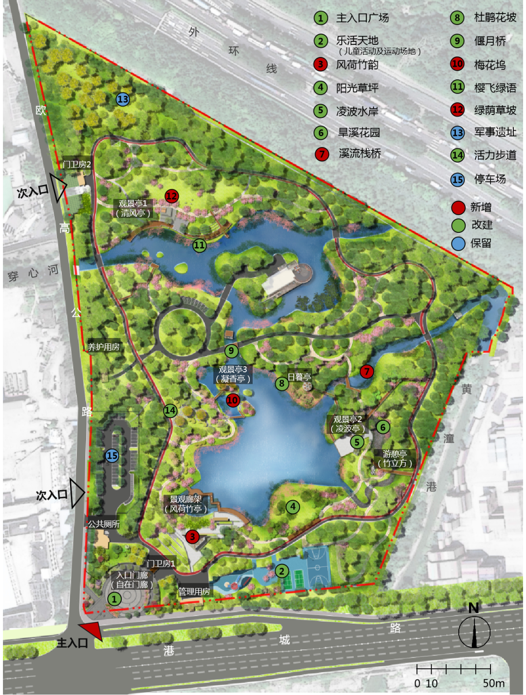 改造时,设计方保留了公园以湖为中心的内向型格局,对南北两湖特色进行分化,在风格和体验上形成差异感。利用现状水资源丰富的特点,营造以“水岸花”为主题特色的景观风貌,北湖强化原有的“自然林境”;南湖增强水环境营造,“人文山水园林”亮相。同时,对公园布局、景点、游步道进行调整和提升,营造一幅传统山水画图景,和小布一起来看看有哪些新亮点吧!