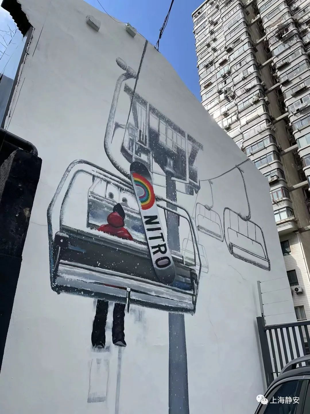 今年店铺左侧墙上的新款雪板涂鸦