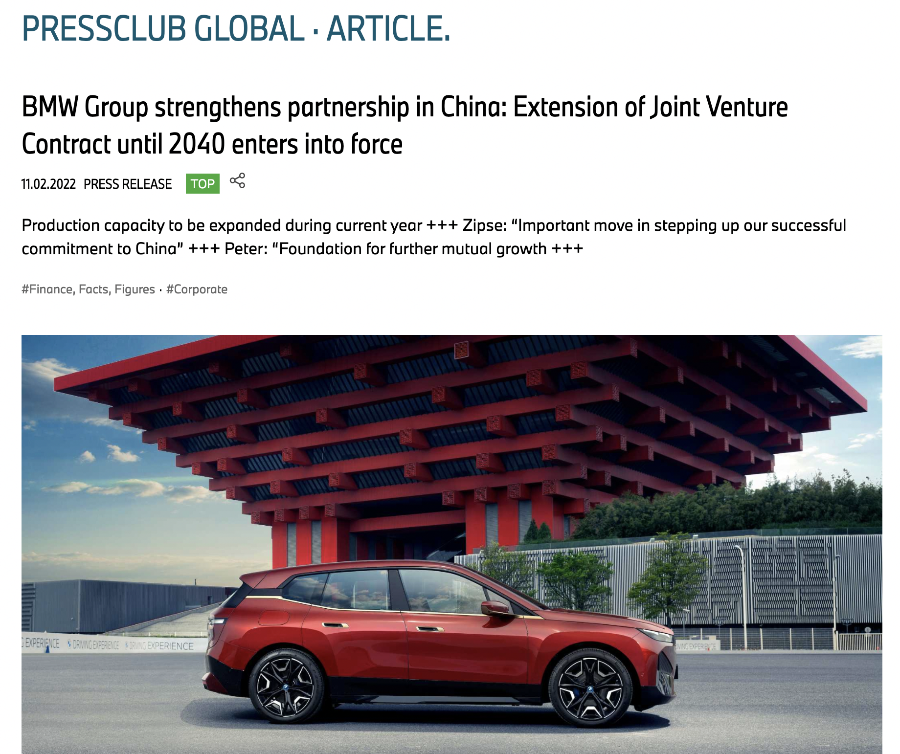 2月11日,澎湃新闻从宝马汽车官方网站获悉,即日起,宝马集团在中国的合资企业华晨宝马汽车有限公司(下称“华晨宝马”)新合资合同正式生效,宝马集团与其中方合作伙伴的合资合作有效期据此延长至2040年。