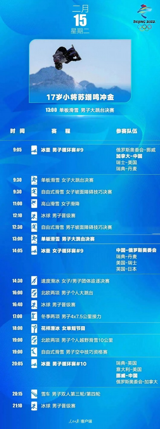 自由式滑雪女子坡面障碍技巧决赛,谷爱凌将继续向领奖台发起冲击。而在单板滑雪赛场上。苏翊鸣、荣格分别出战男子、女子大跳台决赛。