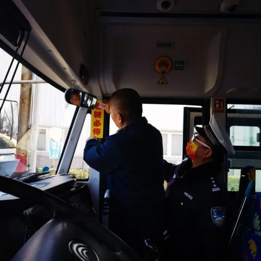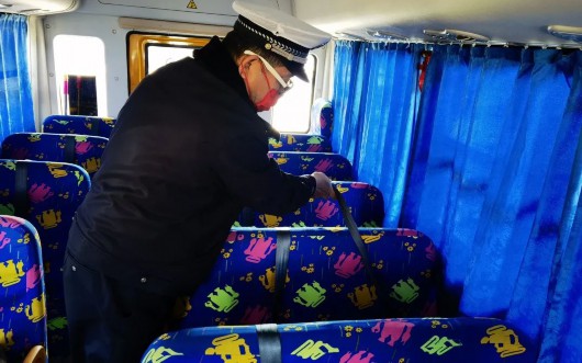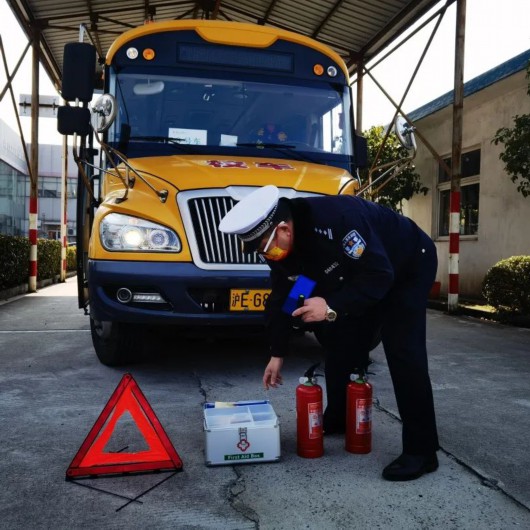 民警对每辆校车的校车标牌、停车指示标牌、安全锤、灭火器、逃生锤、“右转必停”警示标志贴纸等安全设备进行了细致地检查。