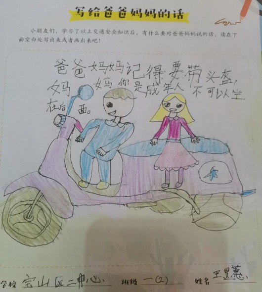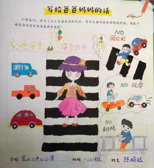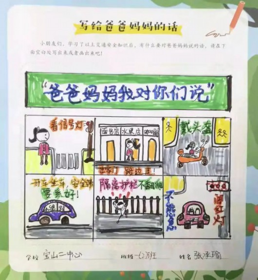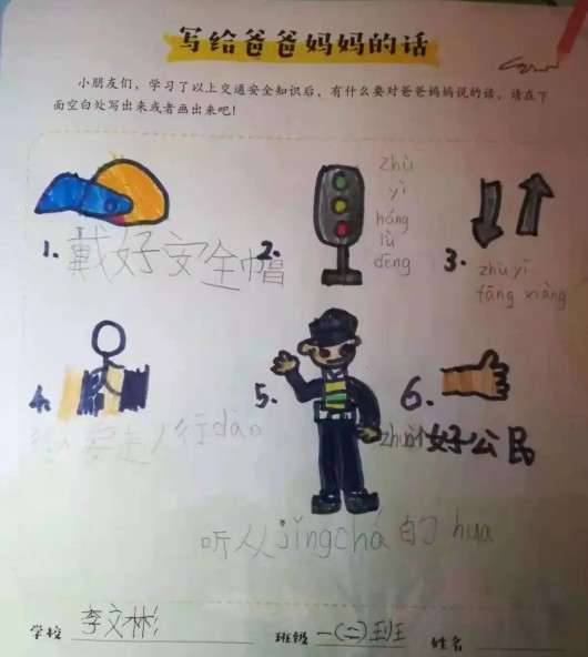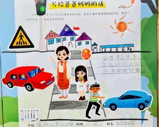 孩子们在学习交通安全课程的同时,也不忘用画笔和文字在交通安全漫画读本上写下自己对于交通安全出行的感受,并表达了自己想对父母说的话及对他们的爱。