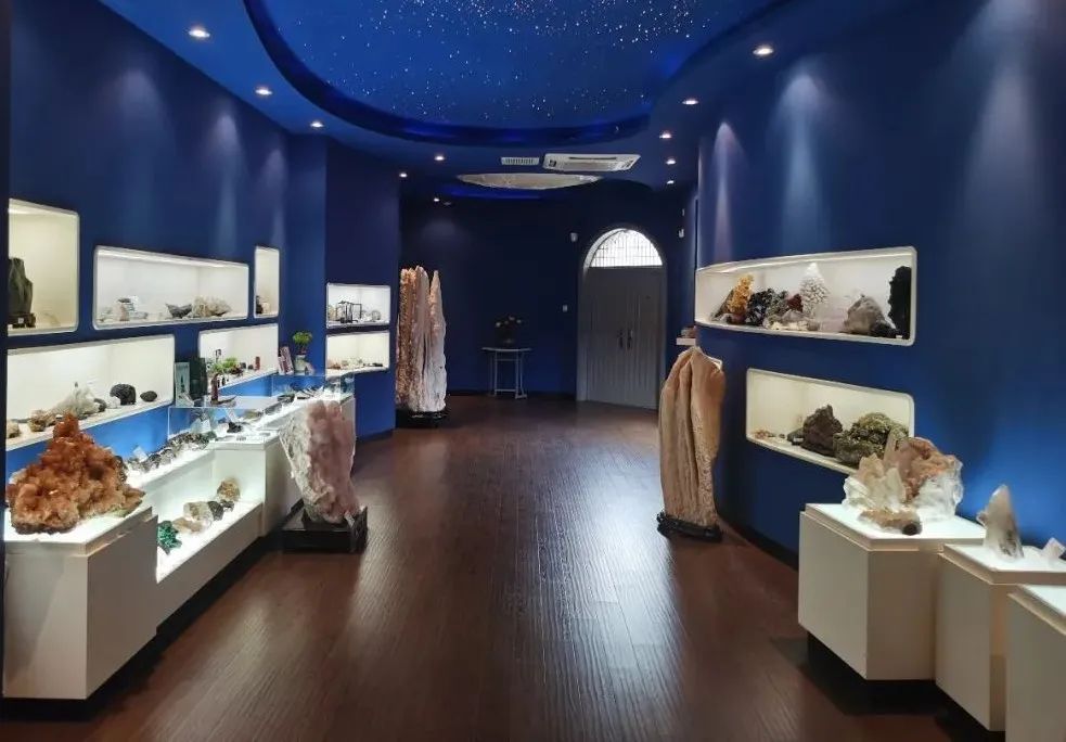 室内展示空间又是另一番天地。矿物晶体、美石、宝石和各类典型岩石,这些种类繁多、各式各样的石头,被分门别类地或陈列于展示柜上或整齐地摆放在地面上,有的晶体还发出了奇异的光彩。这些美轮美奂的石头不仅具有观赏性,更蕴藏着许多历史与科学知识。