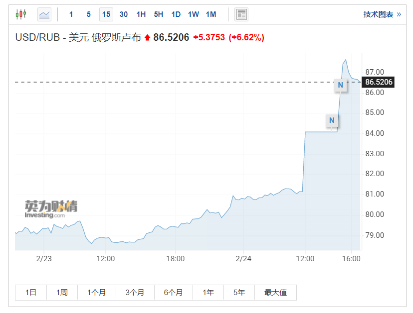 2月24日,全球市场因俄乌冲突而暴跌,处于风暴中心的莫斯科交易所不得不在主要股指暴跌40%后暂时关闭交易,美元对俄罗斯卢布也骤升至86.65。