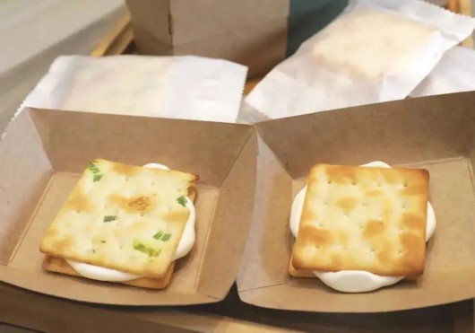除却麻薯,牛轧糖饼干也是大家无限回购的单品,有原味和葱香口味两种。上下两层是香脆的饼干,中间夹了牛轧糖。咸味和糖味,听起来是有点奇怪的组合,但咬一口下去,听到脆啵啵的声音,是满满的幸福感。仅仅只是多了一层糖心,但饼干美味瞬间升级,咸甜搭配好吃到根本停不下来。