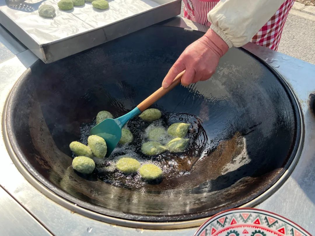 除了鲜美的草头肉馅,吴阿姨制作的塌饼还有传统的豆沙甜馅和颗粒满满的芝麻馅。准备工作就绪,就开始制作塌饼了。捏一小团花绿的剂子合在手心里捏圆,包上自制的馅儿,就成了可爱的草头塌饼。而另一边,吴阿姨的老伴已经开始生柴火热油锅。待油锅热好,听着塌饼下锅的“滋滋”声,眼见着青绿团子逐渐煎至两面金黄,就可以出锅了。一口咬下去,香脆的外皮泛着青草香,里头的草头肉馅更是鲜美多汁,令人垂涟。
