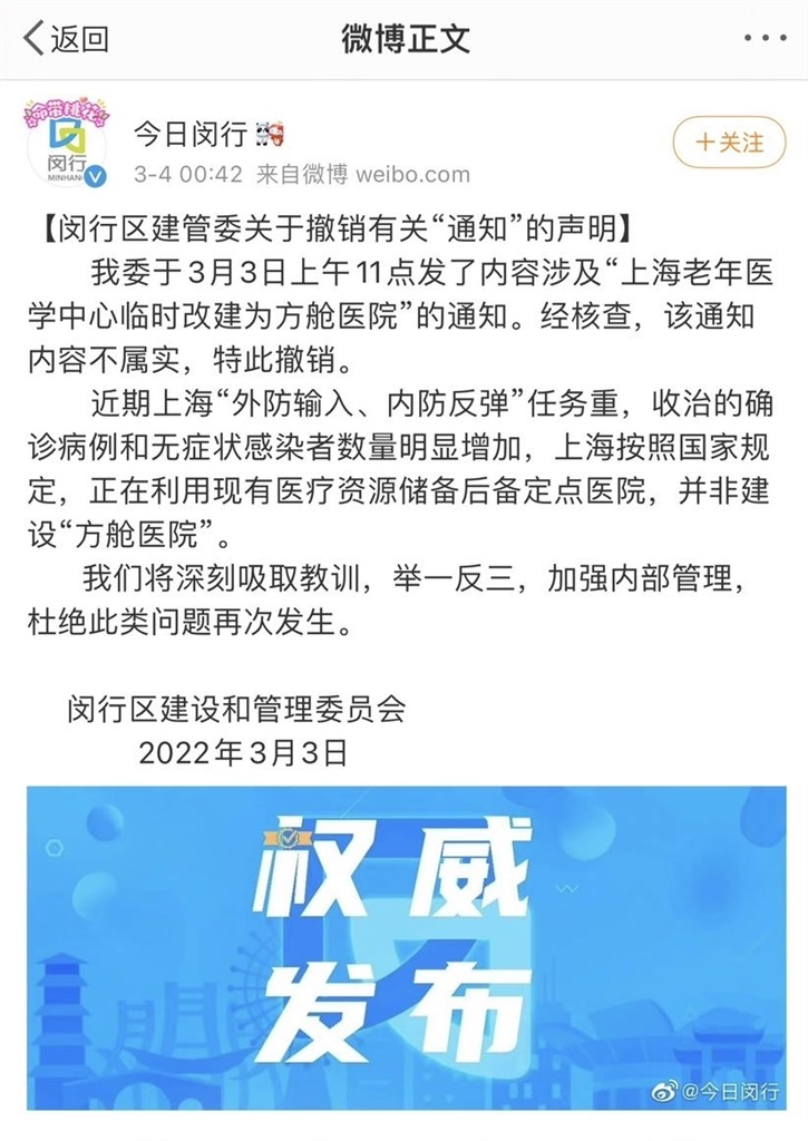 上海市闵行区新闻办官方微博今天0点42分发布了一则闵行区建设和管理委员会的声明。声明称,闵行区建管委 3月3日上午11点发了内容涉及“上海老年医学中心临时改建为方舱医院”的通知。经核查,该通知内容不属实,特此撤销。