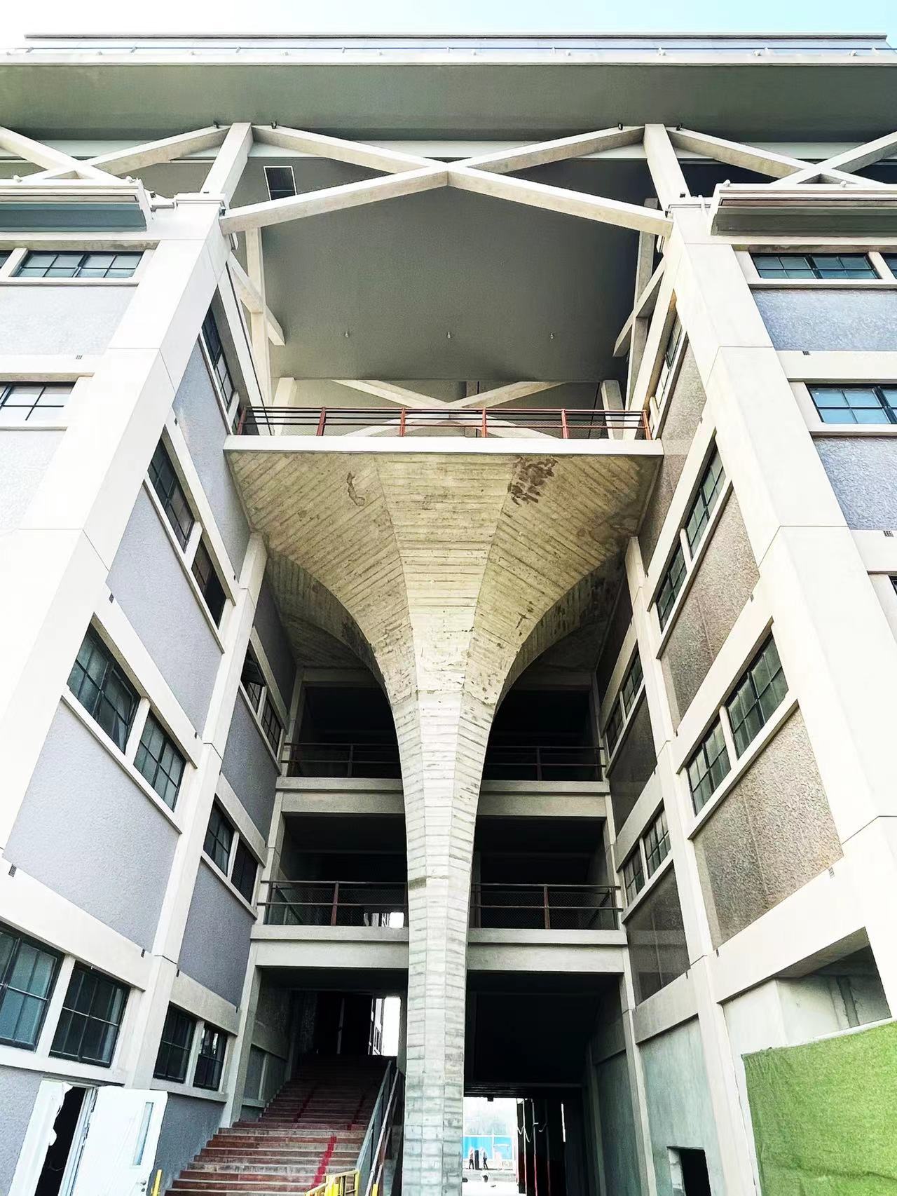 永安栈房的东西楼之间,留出了一道9米见宽的缝隙,从而为整栋建筑提供了一条视线通透的南北轴线,绘制了一幅完全对称的古典主义构图。出于节约交通空间的考虑,在间隙自南向北的第3-5跨内,建造了一个集约水平和垂直流线的交通枢纽,其中包括朝南的一座开敞式混凝土双跑楼梯,朝北外挂的一部货运电梯,以及连接东西楼的主入口和二层过道平台。间隙上方是突起的屋顶水箱,通过斜向支撑架空在仓库顶部。工业建筑连续冗长的界面由此被打破,阳光透过混凝土楼梯洒在北侧广场上,塑造出极具雕塑感和朝圣感的空间形制,既强调了南北轴线的仪式感,也通过虚实对比消解了厚重建筑体量引发的压迫感。