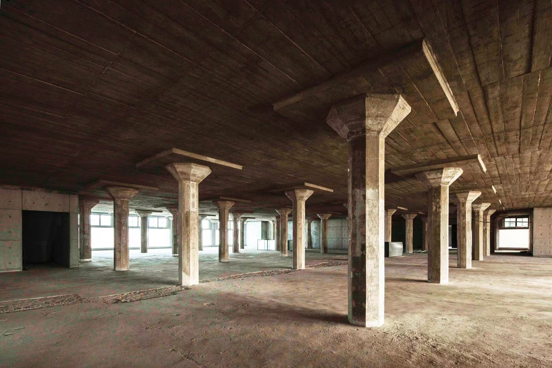走进永安栈房,呈现出的是一派早期现代主义风格的工业建筑场景。东西楼层高一致,均是首层4.95米,2-3层3.65米,4层4.05米。1-3层的钢筋混凝土框架结构选用了当时最先进的无梁楼盖的承重方式,柱头侧向放宽约200毫米,从而在八角形楞柱的顶端支起一个棱角斗状柱帽托,撑起上方的天花板。其线脚流畅简洁,受力均衡理性,在上海实属罕见,更是钢筋混凝土建造技术在我国的早期实践,具有重要的历史价值、技术价值和美学价值,反映了建筑师在受力合理和空间高效之间寻求最优解的聪明才智。这不由让人联想到美国工程师巴林格和佩罗特在20世纪初为工业建筑发明的钢筋混凝土蘑菇柱结构。值得一提的是,永安栈房的4层顶部选用的是井格梁,而结构柱截面从首层的650毫米×650毫米到4层逐层收缩到300毫米×300毫米,进一步强调了结构理性的设计初衷。